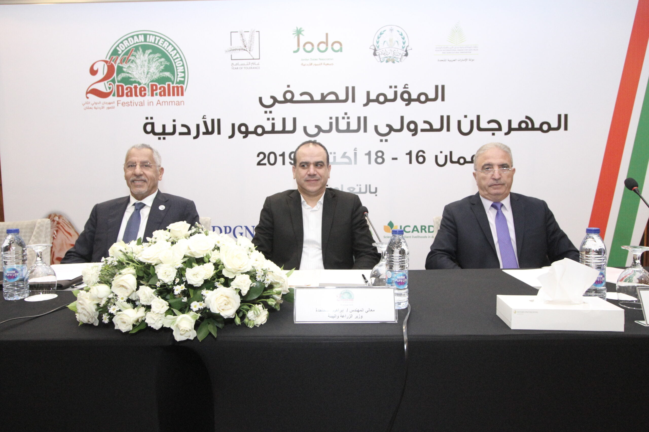 عبد الوهاب زايد: 65 مزارع وشركة منتجة من أربع دول عربية و 20 باحث مشارك في الندوة العلميةأعلنت وزارة الزراعة في المملكة الأردنية الهاشمية عن فعاليات المهرجان الدولي الثاني للتمور الأردنية 2019 بالتعاون مع جائزة خليفة الدولية لنخيل التمر والابتكار الزراعي وجمعية التمور الأردنية في العاصمة الأردنية عمان خلال الفترة 16-18 تشرين الأول/أكتوبر 2019. بمكرمة من سمو الشيخ منصور بن زايد آل نهيان نائب رئيس مجلس الوزراء وزير شؤون الرئاسة بدولة الإمارات العربية المتحدة، جاء ذلك في كلمة معالي المهندس إبراهيم الشحاحدة وزير الزراعة الأردني خلال مؤتمر صحفي عقد بفندق انتركونتيننتال عمّان بحضور سعادة أحمد علي محمد البلوشي سفير دولة الإمارات العربية المتحدة بالمملكة الأردنية الهاشمية، وسعادة الدكتور عبد الوهاب زايد أمين عام جائزة خليفة الدولية لنخيل التمر والابتكار الزراعي بدولة الإمارات العربية المتحدة، والمهندس أنور حداد مدير جمعية التمور الأردنية، وعدد من ممثلي المنظمات الدولية المقيمين بالأردن.