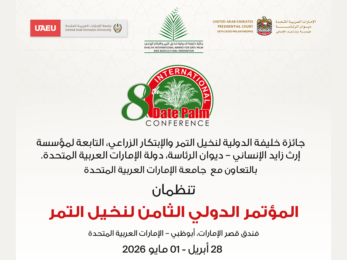 The Award’s General Secretariat is honored to invite Your Excellency to the Eighth International Date Palm Conference, 2026, to be held with the presence of H.E. Sheikh Nahayan Mabarak Al Nahayan, Minister of Tolerance and Coexistence, Chairman of the Award’s Board of Trustees, and H.H. Sheikh Theyab bin Mohamed bin Zayed Al Nahyan, Deputy Chairman of the Presidential Court for Development and Fallen Heroes’ Affairs, Chairman of the Board of Trustees of the Erth Zayed Philanthropies Foundation. The Conference is organized in close cooperation with the esteemed UAE University, and a number of ministries, national and international organizations, and which will take place from the 28th of April – 01st of May, 2026, at the Emirates Palace Hotel, Abu Dhabi, UAE.