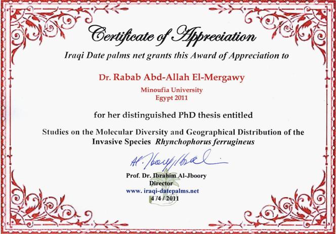 منح الدكتورة رباب المرجاوي من مصر جائزة الشبكة العراقية لنخلة التمر للنصف الاول من عام 2011 عن اطروحتها للدكتوراه