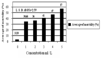 اوضحت النتائج الواردة في شكل (1) ان تركيز (5) مل مبيد حيوي/ لتر ماء، قد سبب اعلى نسبة هلاك لحشرة المن، حيث بلغت (57%) وبتفوق معنوي على جميع التراكيز الاخرى. كما أظهرت التراكيز الاخرى فعالية جيدة في مكافحة الحشرة، إذ بلغت معدلات نسب الهلاك في التركيزين (3و4) مل مبيد حيوي/ لتر ماء، (41 و 47%) على التوالي، ومن ناحية اخرى سببت التراكيز (1و2) مل مبيد حيوي/ لتر ماء، نسب هلاك مرتفعة للحشرة مقارنة بمعاملة السيطرة (تركيز صفر).
