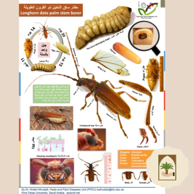 يعتبر حفار ساق النخيل ذو القرون الطويلة من الافات الاقتصادية